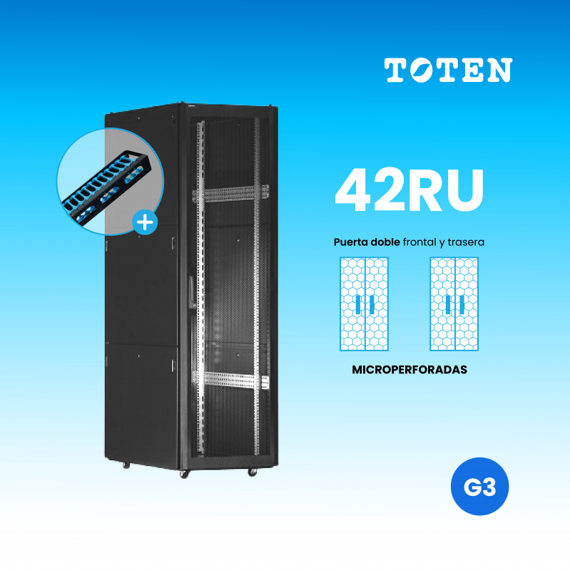 Gabinete de piso Toten de 42 RU, ideal para soluciones de alta densidad. Ofrece excelente ventilación con puertas doble microperforadas, estructura robusta y diseño que facilita la gestión de cables y el mantenimiento.