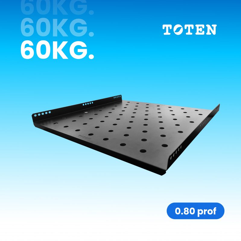 La bandeja fija Toten modelo SG.0147.1901 es un accesorio resistente diseñado para gabinetes de piso con 0.80 m de profundidad. Fabricada en acero laminado en frío, soporta hasta 60 kg, ideal para organizar equipos de forma segura dentro del rack.
