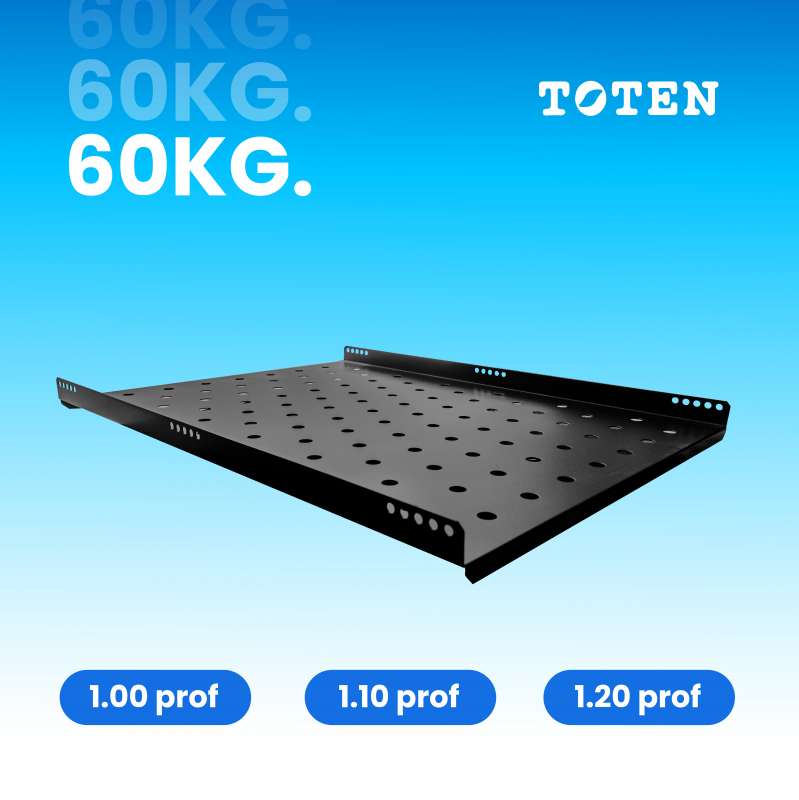 La bandeja fija Toten modelo SG.0165.1901 es ideal para gabinetes de piso con profundidades de 1.00, 1.10 y 1.20 metros. Fabricada en acero laminado en frío, soporta hasta 60 kg, ofreciendo un soporte seguro y resistente para organizar equipos en el interior del rack.