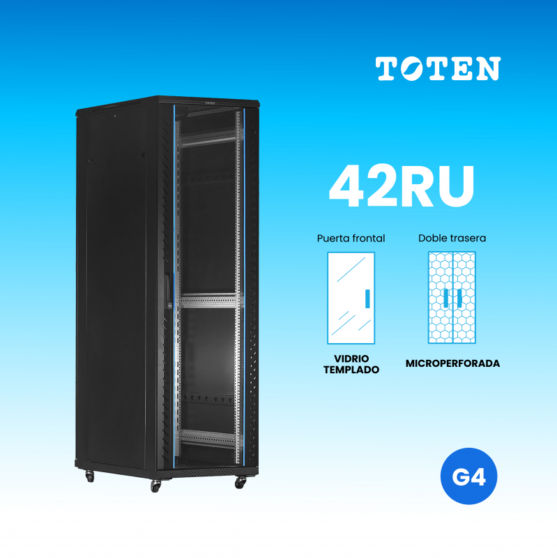 Gabinete de piso TOTEN de 42 RU, diseñado para aplicaciones que requieren acceso práctico, ventilación eficiente y alta capacidad de carga. Cumple con estándares internacionales de calidad y resistencia.